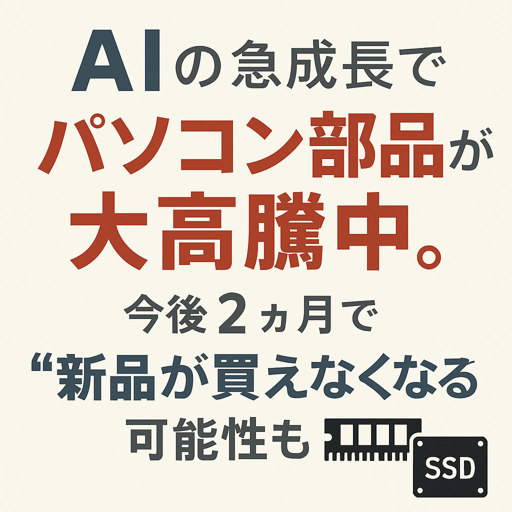 もっと読む現在パソコン業界では、AIの成長によるパソコンのパーツの大高騰が起こっております。 具体的には、11月まで1万円ほどだったメモリというパーツが3万ほどに、 SSDというデータを保存するパーツが1万ほどだったのに1万5千円 […]